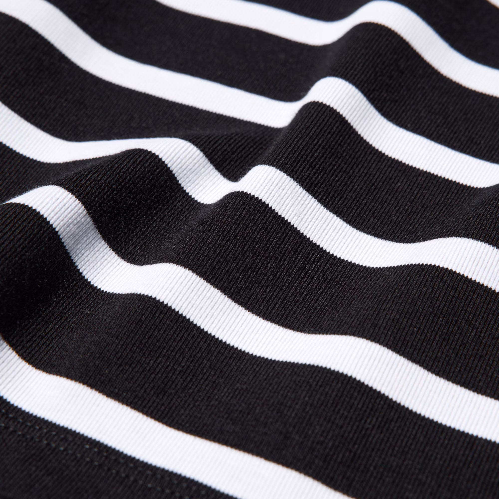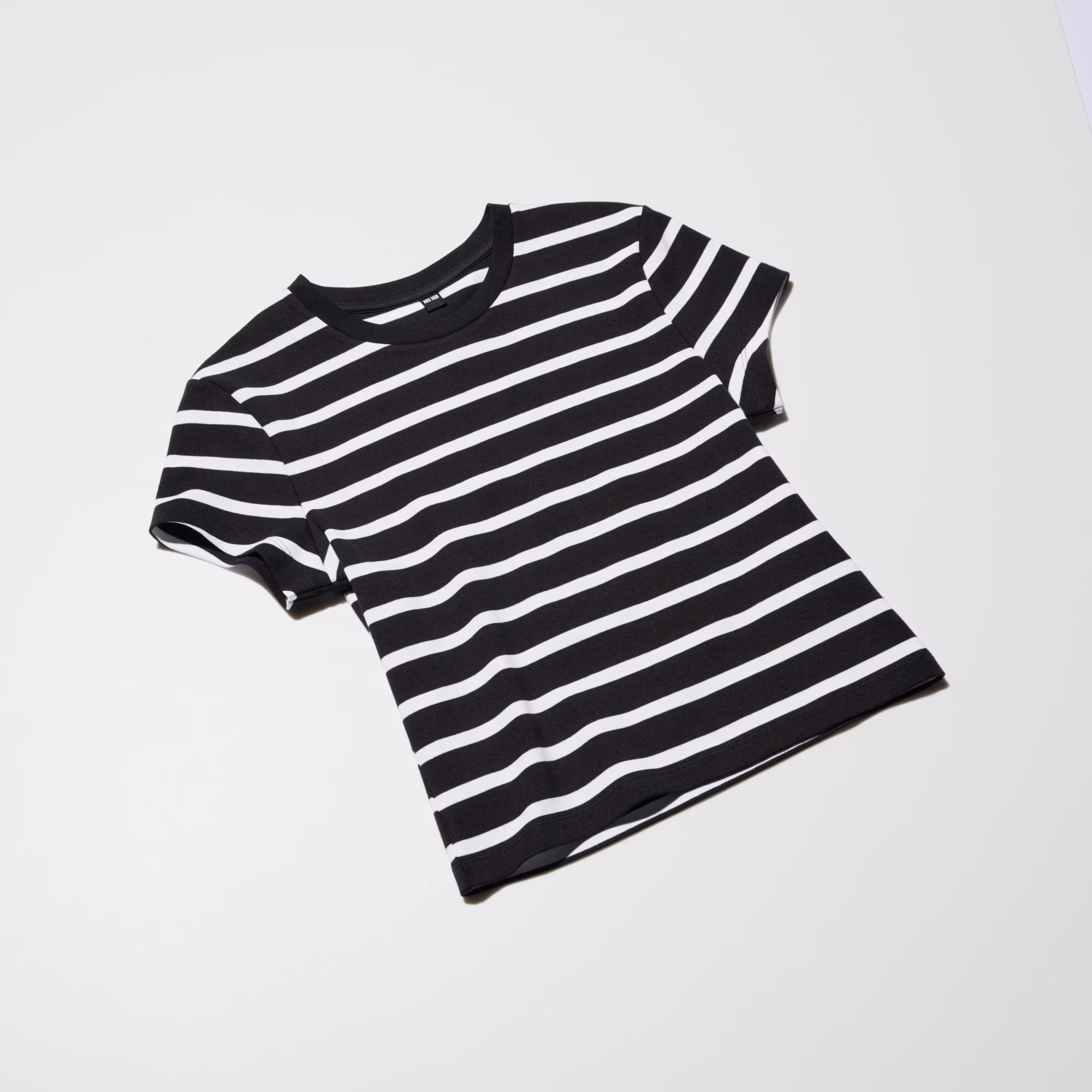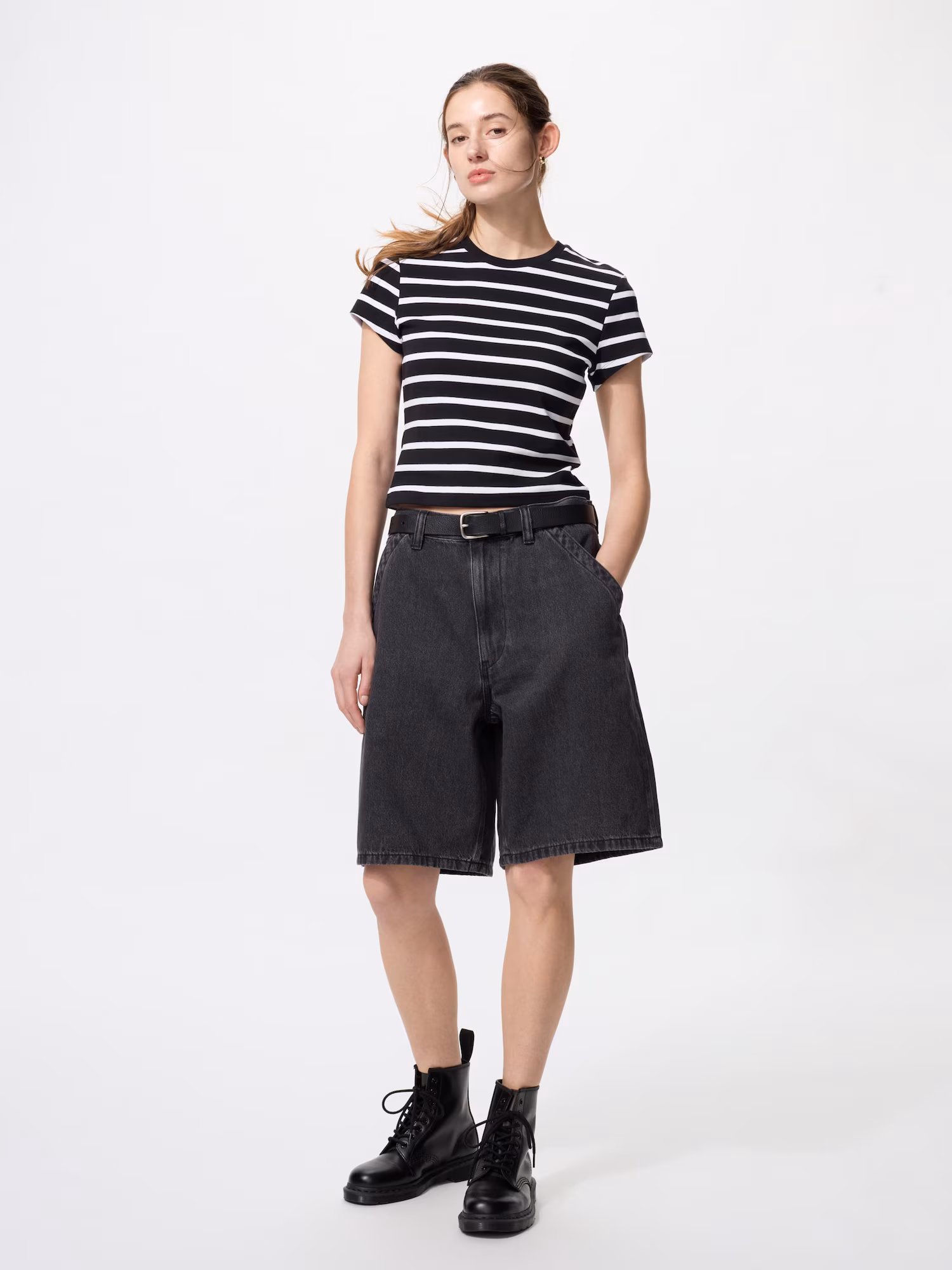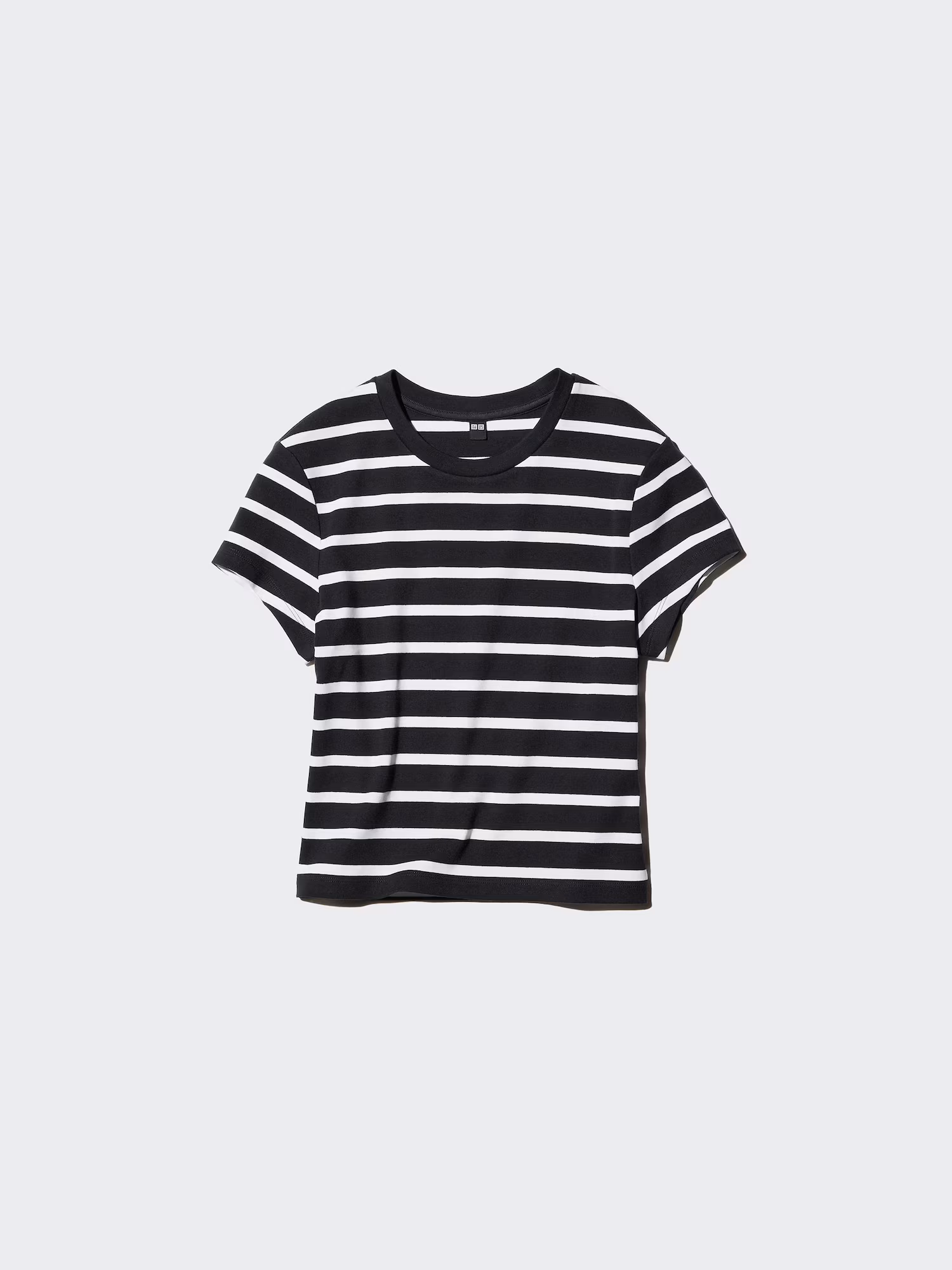 T-shirt basic lengan pendek berukuran pendek dan siluet yang pas di badan. Desainnya versatile, dengan bahan senada pada bagian neckline.